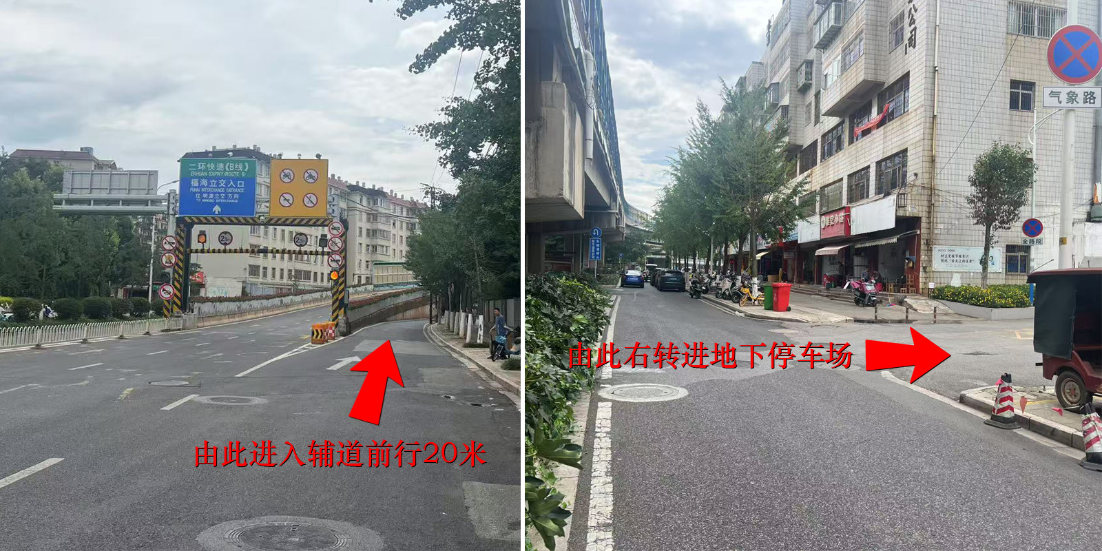 開(kāi)車(chē)路線導(dǎo)航:請(qǐng)沿著氣象路上二環(huán)方向,按左上圖所示走輔道(不要上高架)前行20米,按右上圖所示右轉(zhuǎn)下地下停車(chē)場(chǎng),進(jìn)入停車(chē)場(chǎng)急左轉(zhuǎn)直行下負(fù)三樓,在A1地塊4棟(A座寫(xiě)字樓)電梯口(天度集團(tuán)專(zhuān)用停車(chē)位)停車(chē),然后坐電梯至8樓。